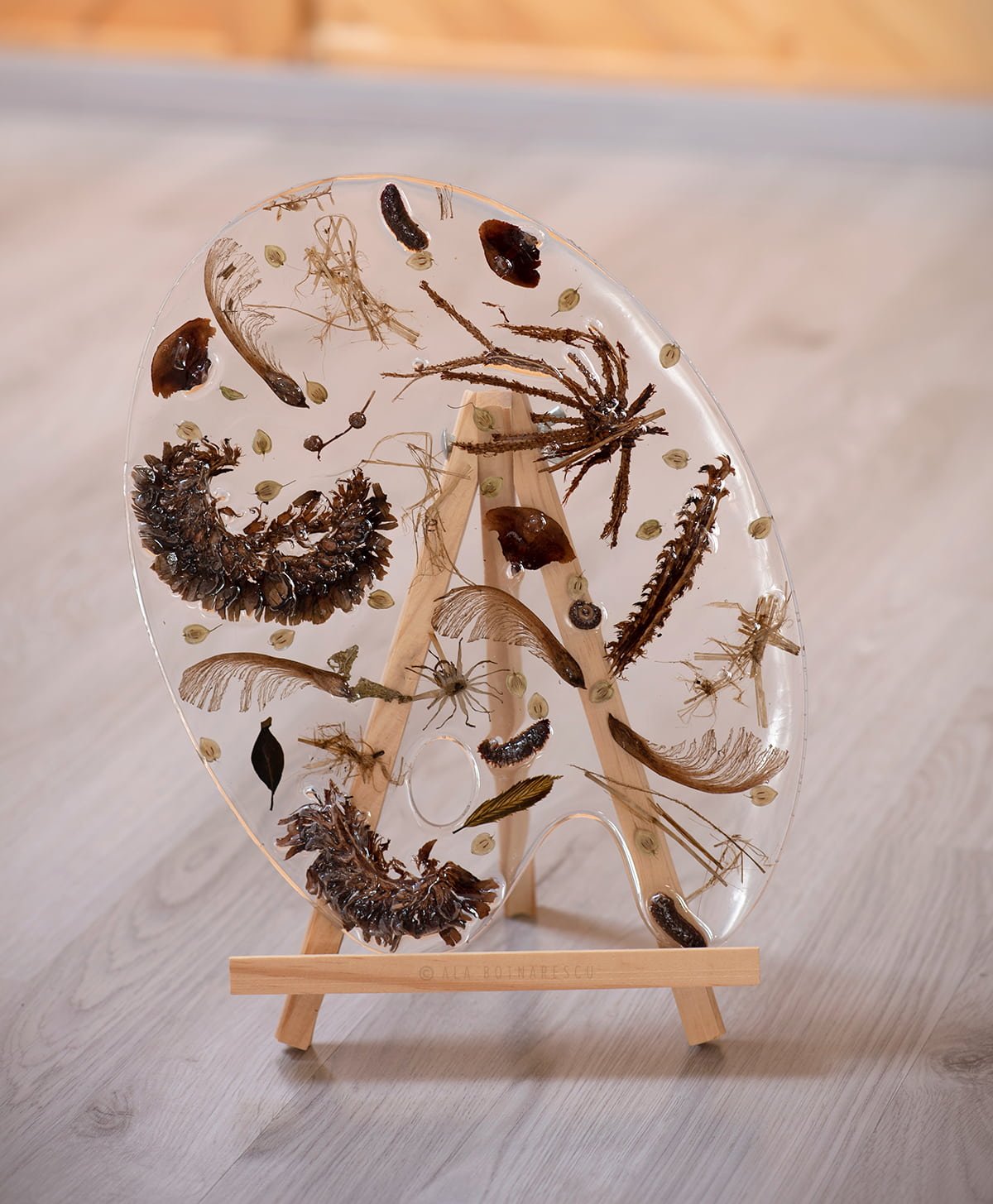 Darüber hinaus kreiere ich Kunstpaletten und Schmuckserien, in denen natürliche Materialien auf besondere Weise verarbeitet werden, um vergängliche Naturfragmente in einzigartige, zeitgenössische dekorative und künstlerische Werke zu verwandeln.