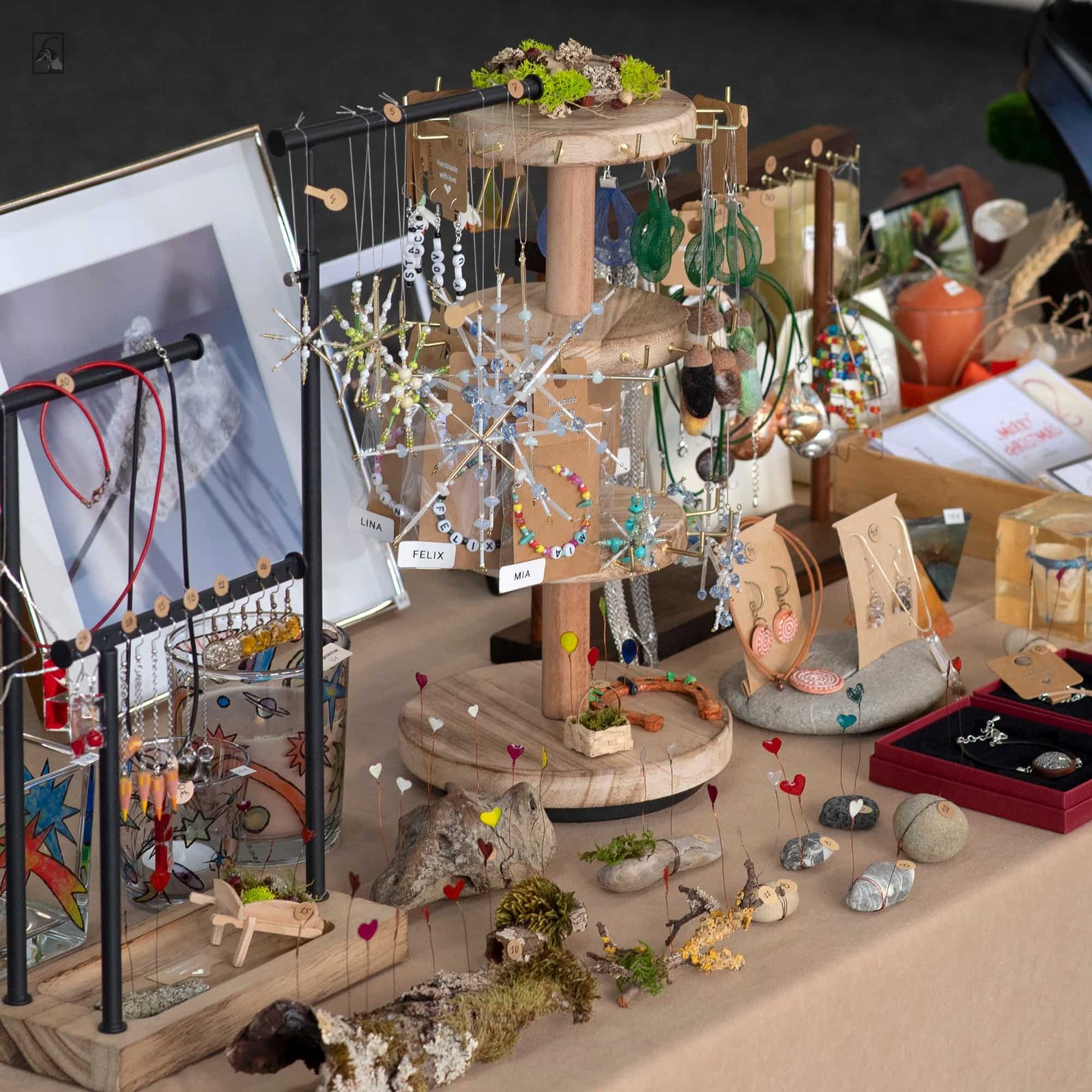 At Weihnachtsmarkt Scheidegg 2025, I had a delightful experience showcasing my handmade winter collection: wire hearts, lucky clovers, beaded snowflakes, resin jewelry with natural elements, and playful photo & plaster magnets.