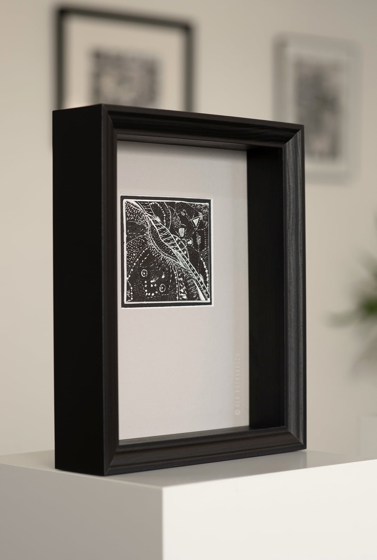 The deep shadow frame (23 × 28 × 6 cm) adds architectural presence. Without glass, the surface remains exposed — breathing, tactile, unapologetically material. Light interacts directly with the engraved texture, enhancing contrast and depth.