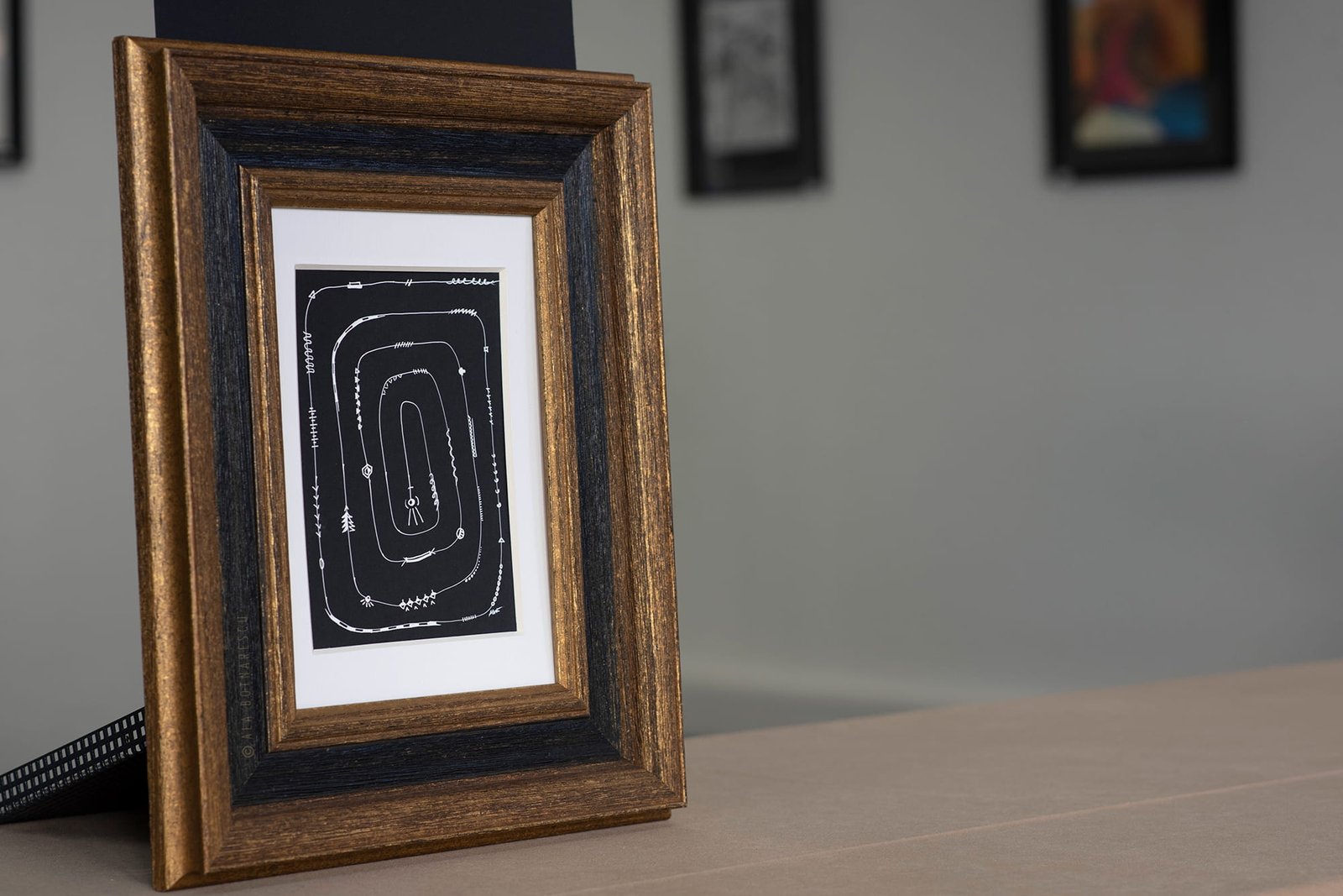 Drawn on A5 format (14.8 × 21 cm) and professionally framed with passepartout in a solid wood frame finished in elegant black and gold tones (35×43.4 cm), the artwork arrives ready to hang and ready to negotiate its place on your wall.